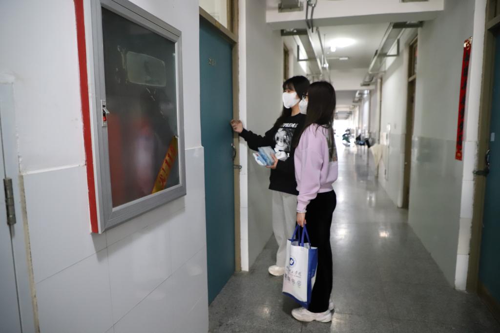 走访最后,两位老师代表建筑工程学院向学生们送上防疫物资,一定程度上帮助学生,尤其是经济困难学生们在疫情期间解决生活方面的困难,并鼓励他们继续努力,立志自强。